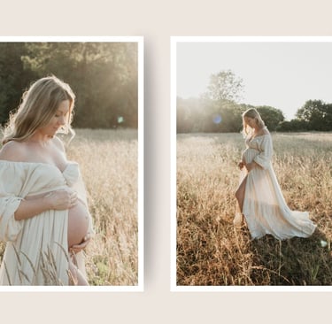 Golden Hour Sessions in an open field — bathed in warm, dreamy light with a soft palette of beige, blush, or gold